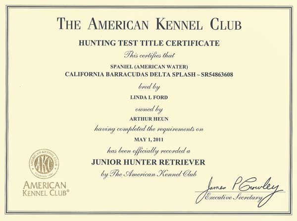 Splash earned his AKC Junior Hunter Retriever title on May 1, 2011 at the Magnolia Retriever Club out of the Jackson Mississippi area. This title requires four passes and he earned the first passes on April 2 and 3, 2011, after American Water Spaniels became eligible to earn AKC Retriever titles on April 1, 2011. He went ‘four for four’ to earn this JH title. He has since earned a Senior Hunter Retriever title and has one Master Hunter Retriever pass. He has been a wonderful companion and hunter.